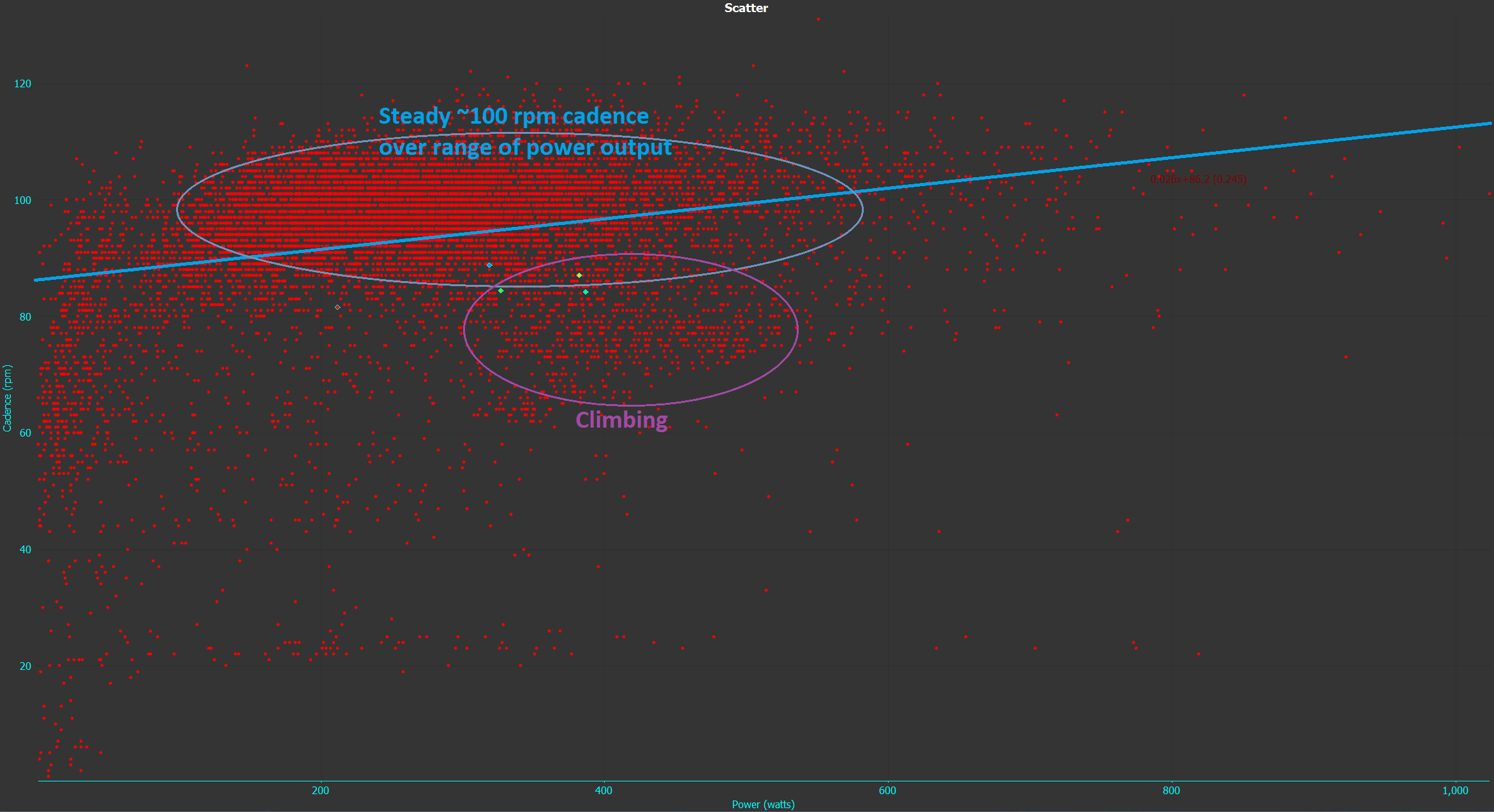 The first thing that stands out is an obvious bunching around cadence of ~100 rpm for a wide range of power outputs, from ~100 to ~500 watts. This reflects a fairly steady tendency to remain around 100 rpm, with a slight preference for higher cadences at higher power (and therefore higher torque/higher inertia, discussed in the last post). I like this consistency. I would call this a good example of cadence endurance.