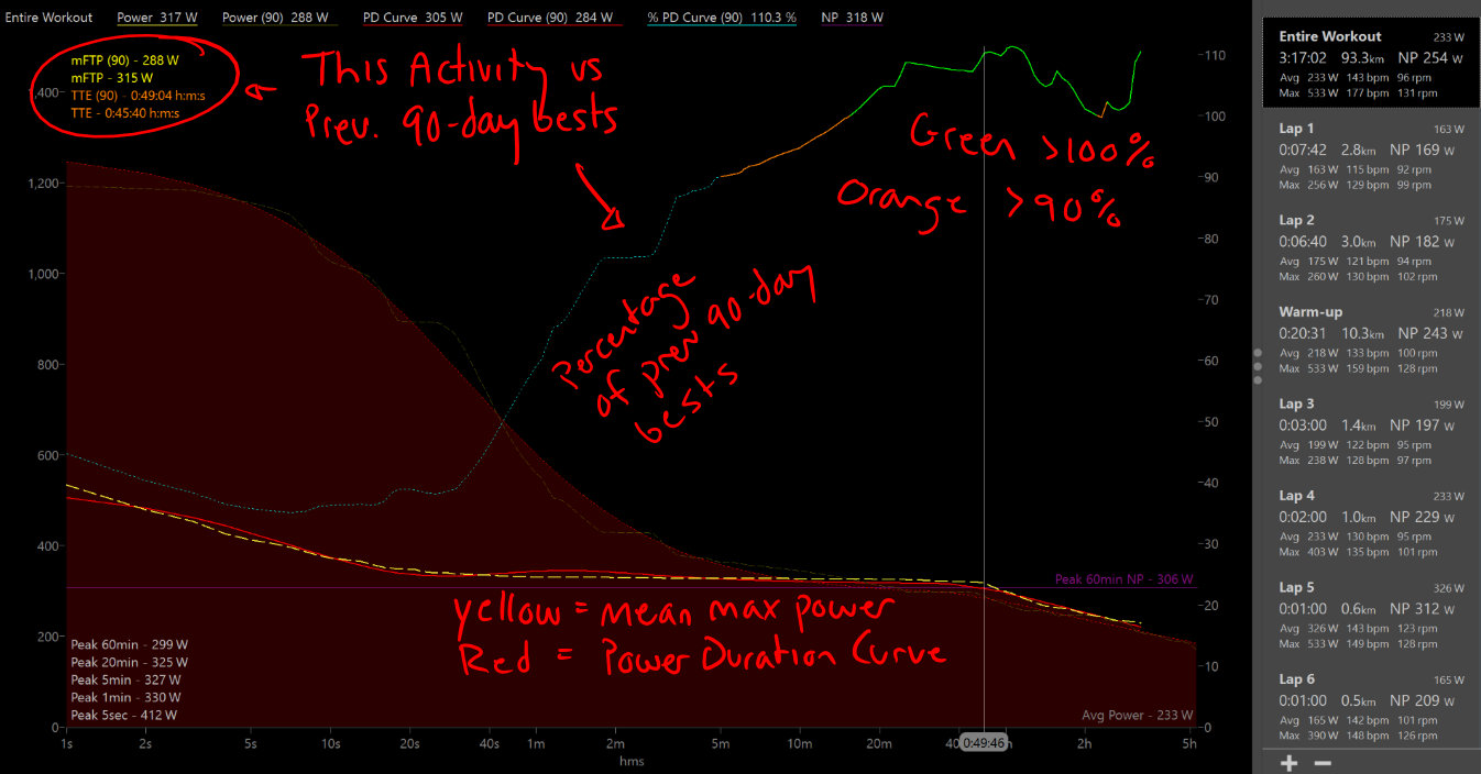 • Note the modeled estimate of FTP and TTE for this activity vs. prev 90-day bests in the top left corner.