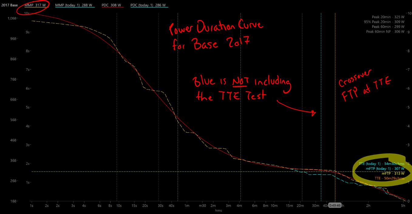 This is my PDC for my Base 2017 cycle thus far, which started Oct 24, 2016. Mean Max Power (MMP) in yellow, PDC (modeled curve) in red. Blue shows the same curve omitting today’s activity, so the numbers not including my TTE test. The highlighted text shows the same; modeled FTP (yellow) and TTE (orange) for the entire Base 2017 training cycle, and for ‘today minus 1’ (blue).