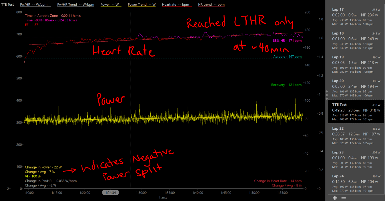 • It shows I was on top of my early power, and increased the workload through the test by around 22 W (7%)