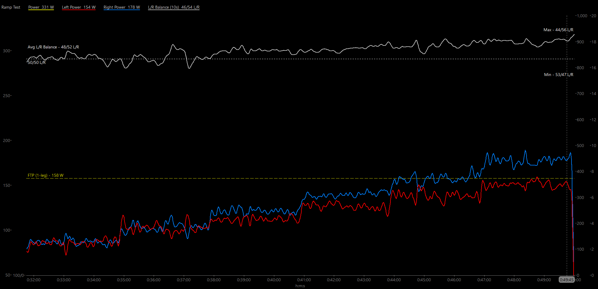However this ramp test was designed to be submaximal, only bringing me to Anaerobic threshold (FTP/LT2/VT2). So I can’t compare whether L/R balance would have diverged further at higher intensities, but I strongly suspect so.