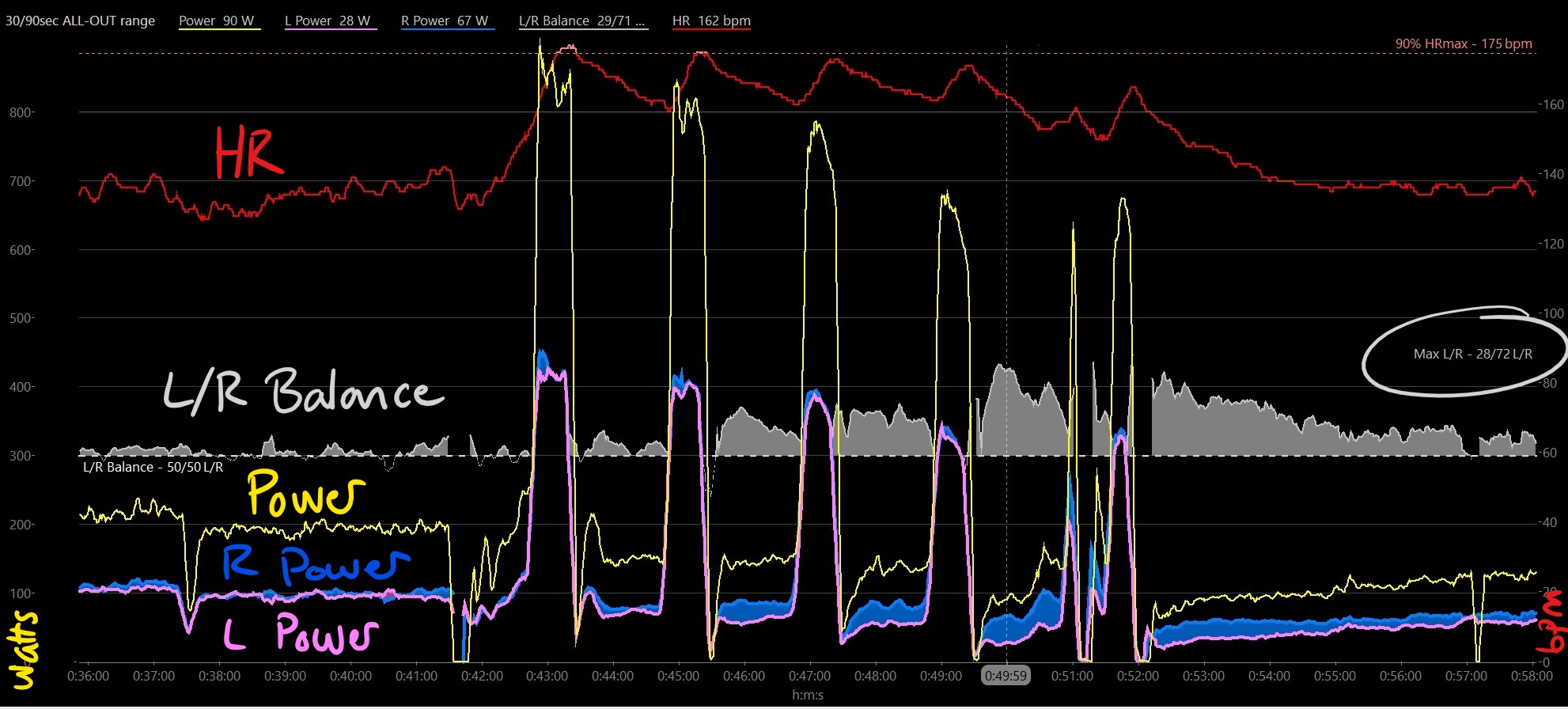 Note how R & L balance began to diverge already (grey area) after the second 30sec interval, but only during the recovery intervals. My power during the 30sec work intervals remained balanced, but the clear decline in net power through the workout suggests that the Left leg was the limiter in the standing sprints. The area highlighted in blue shows the growing gap between R and L leg power.