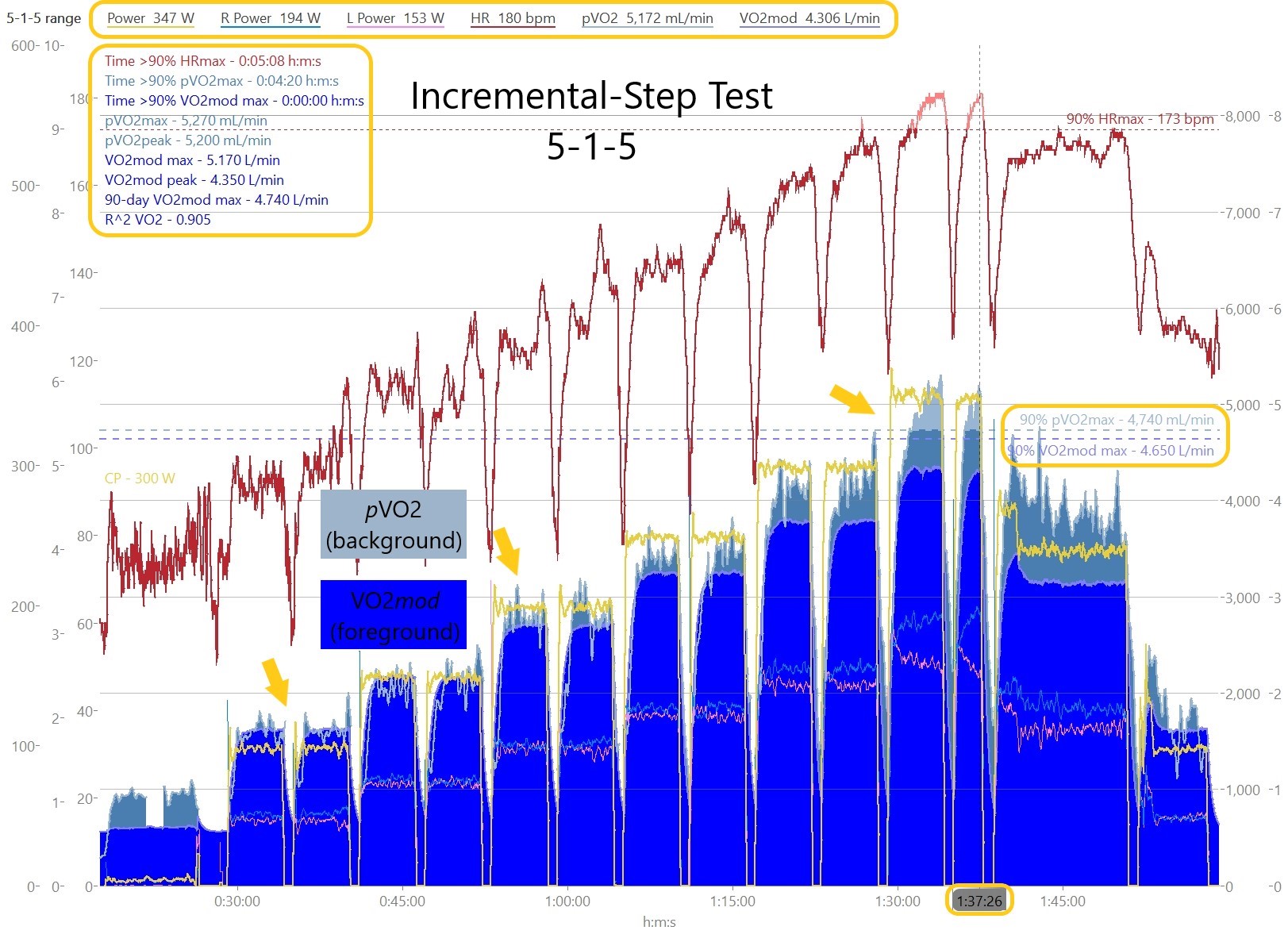 - Note that pVO2max (5270 ml/min) and VO2mod max (5.170 L/min) are retained from the previous ramp test.