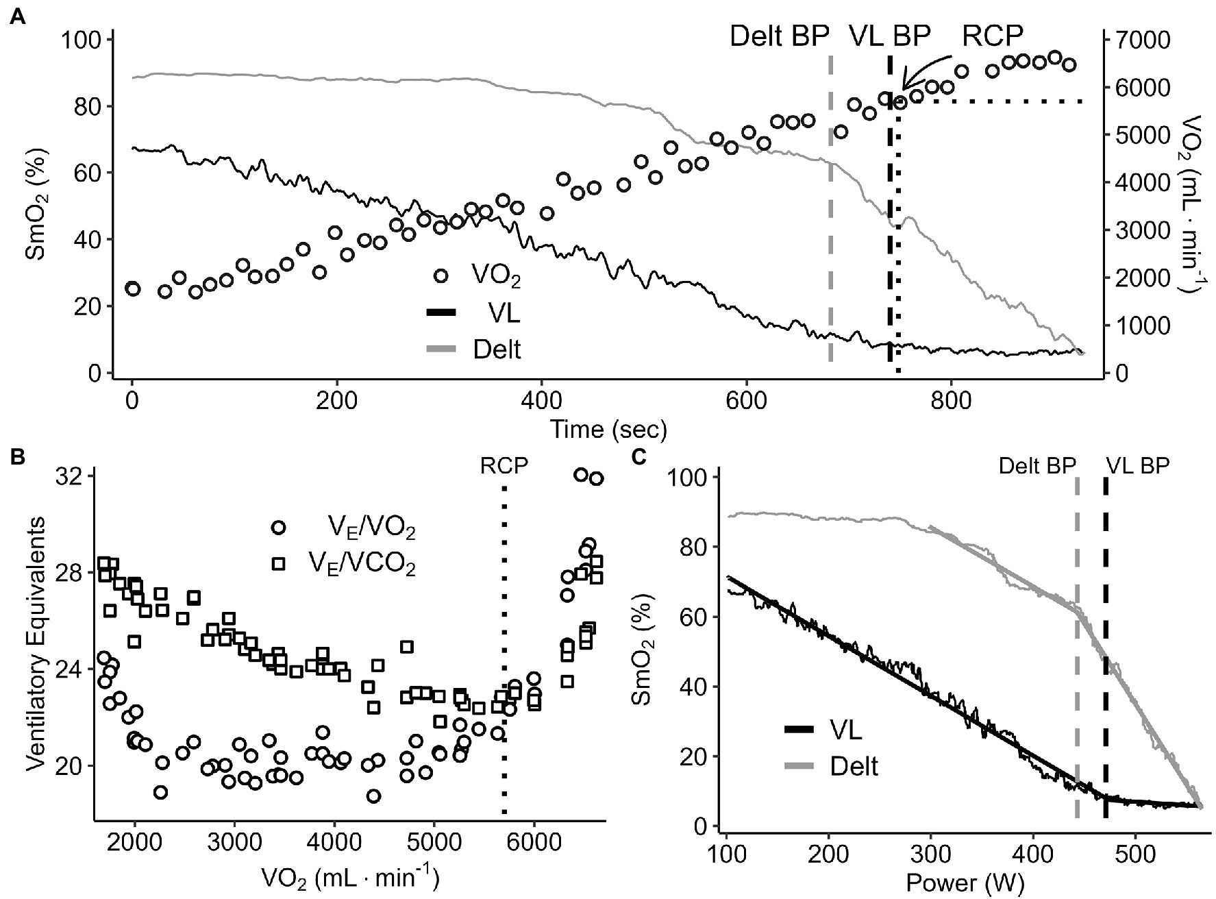 Figure 2. A representative data set of breakpoint detection and comparison between the change in SmO2 (VL and deltoid) and V̇O2 (panel A), ventilatory equivalents of O2 and CO2 (panel B), and SmO2 VL and deltoid profiles (panel C) during a continuous graded exercise test from rest to task intolerance.