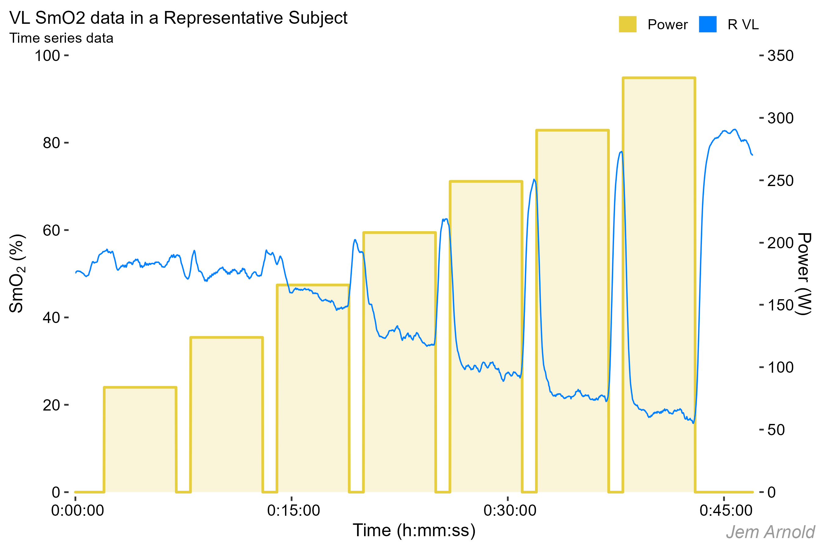 The assessment protocol we used was a ‘5-1’ intermittent step test, with 5-minute constant workload stages separated by 1-min rests. We collected SmO2 from Moxy on the VL and other muscles, although for now we will focus on the response profile in the VL.