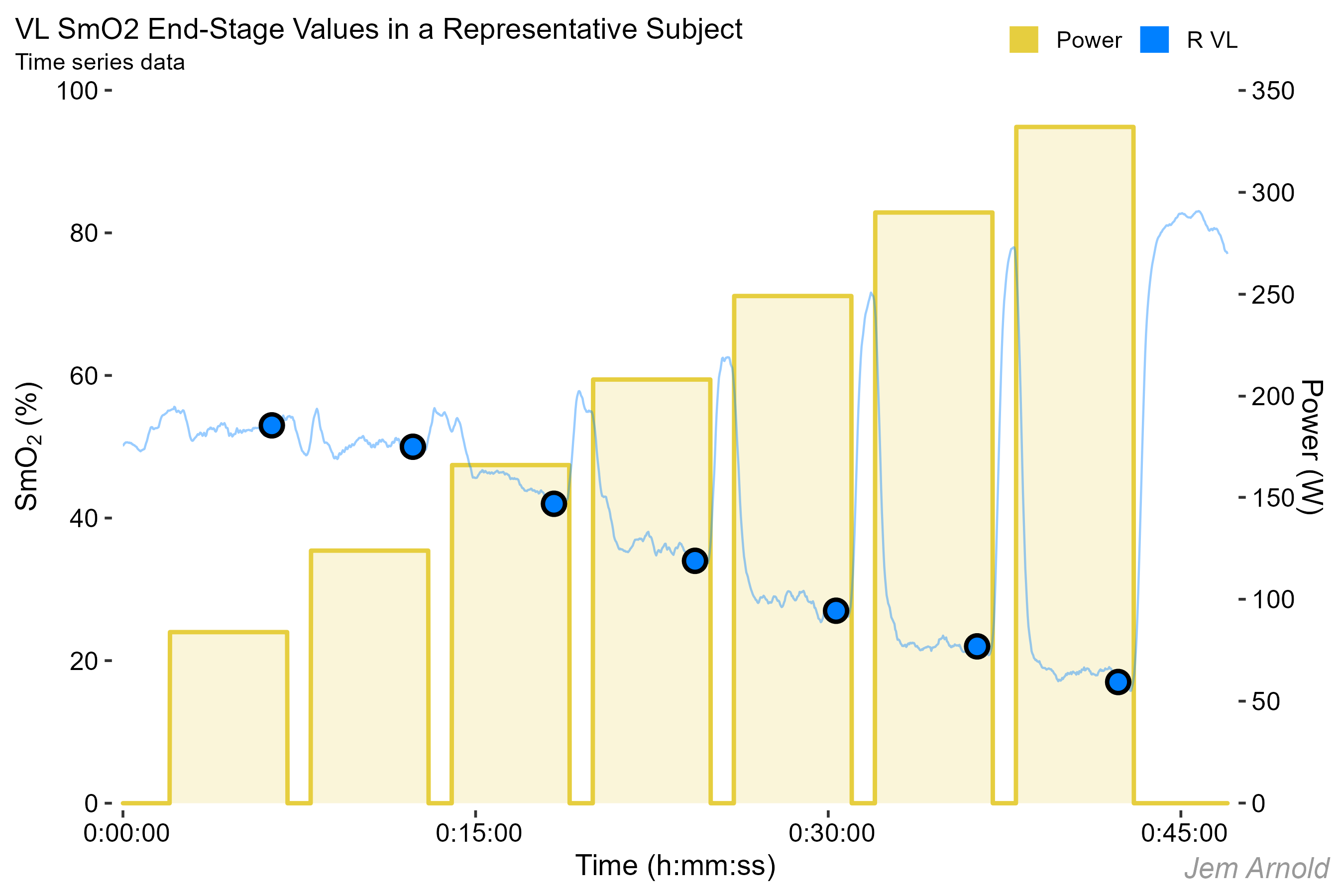 We could plot a smoothed trendline through the end-stage SmO2 data to already observe the oxygenation response profile as a function of increasing intensity for this subject.