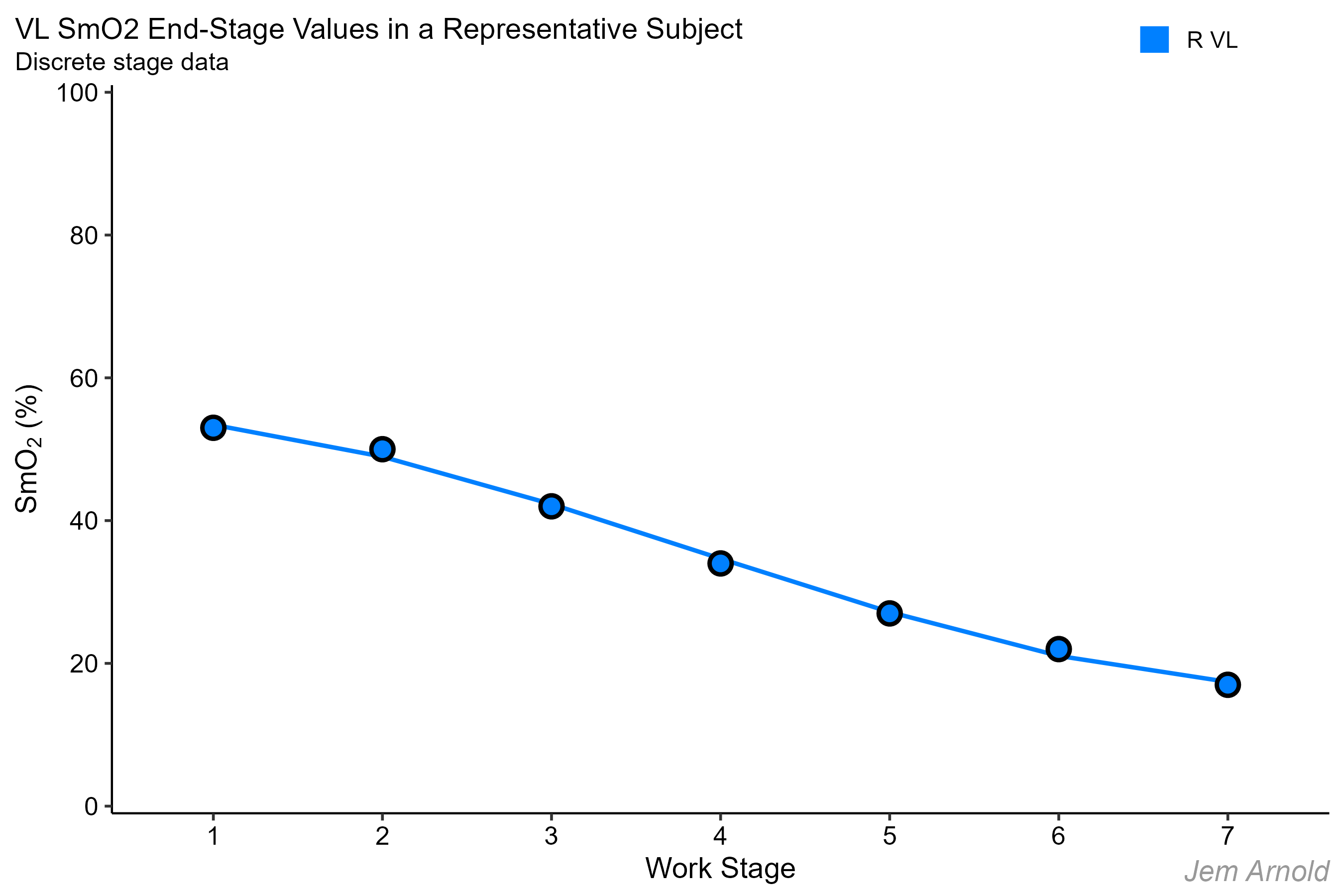 For this discussion we are primarily interested in the SmO2 values during each work stage. We will be ignoring the recovery kinetics between stages for now.