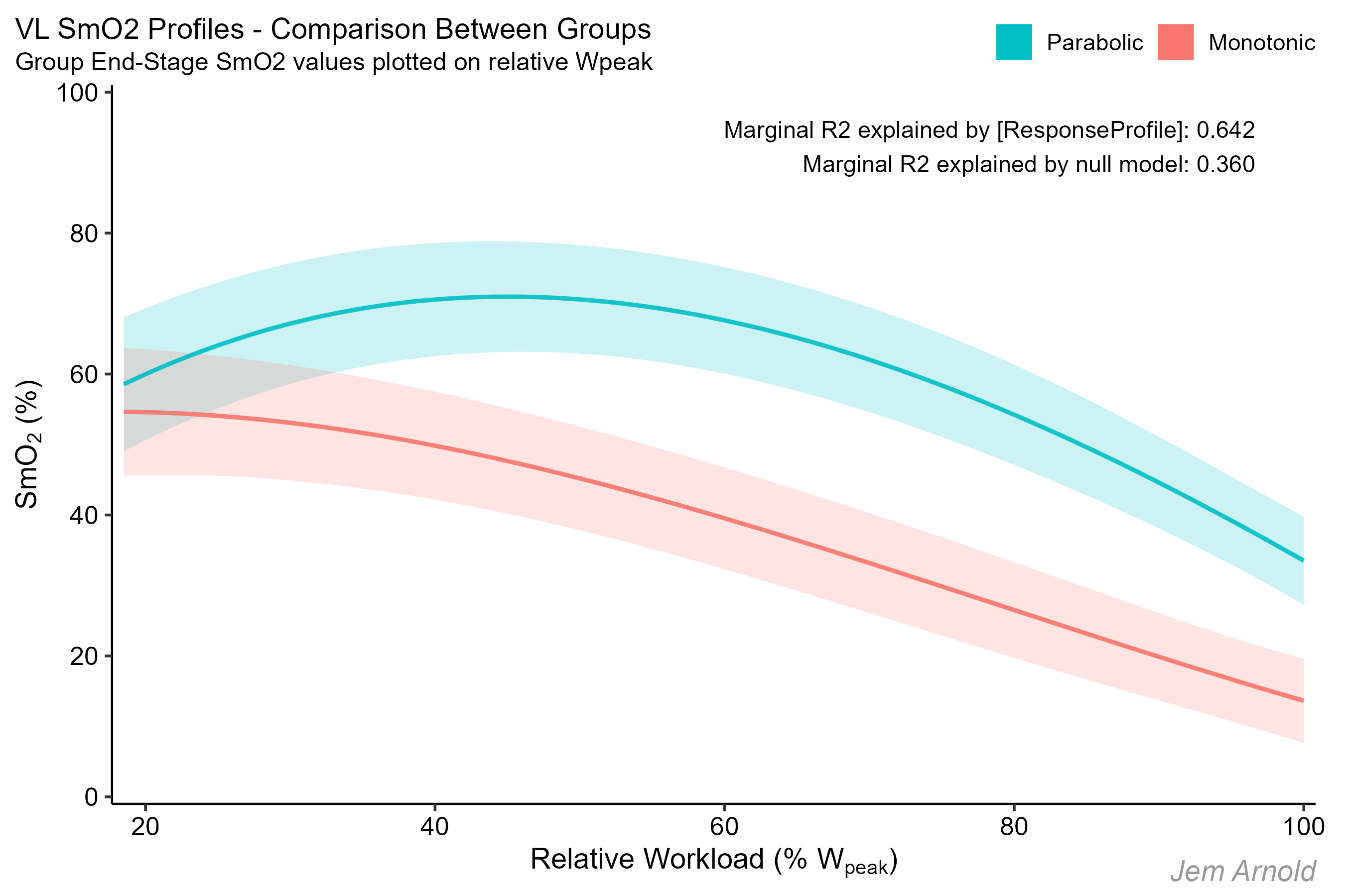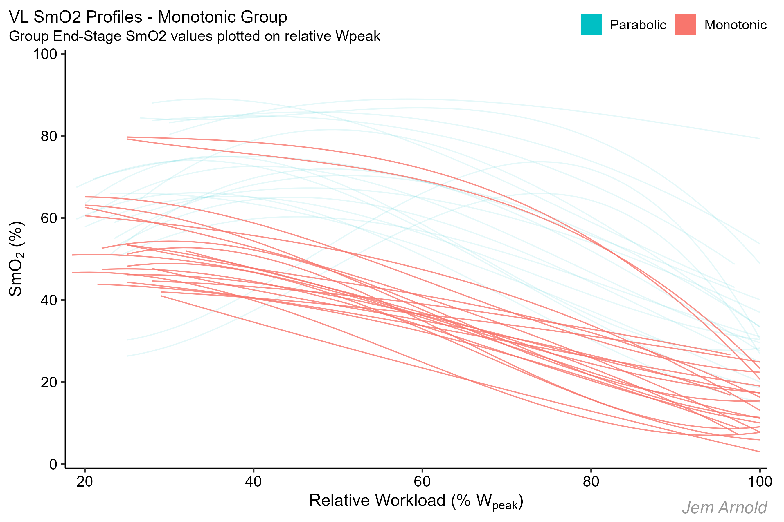 While leaner, larger muscled, highly trained but more glycolytic-predominant athletes may show the most monotonic SmO2 profile. Then, athletes who fall into some combination of these metabolic & mechanical features will demonstrate an oxygenation profile somewhere between the two extremes.