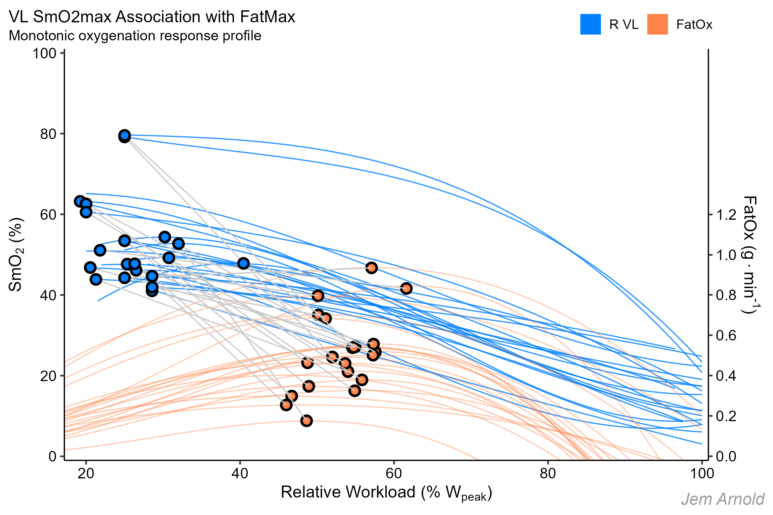 Grey lines connect SmO2max & FatMax values within the same subject. Again considering individual variation, SmO2max might be a reasonable proxy for FatMax.