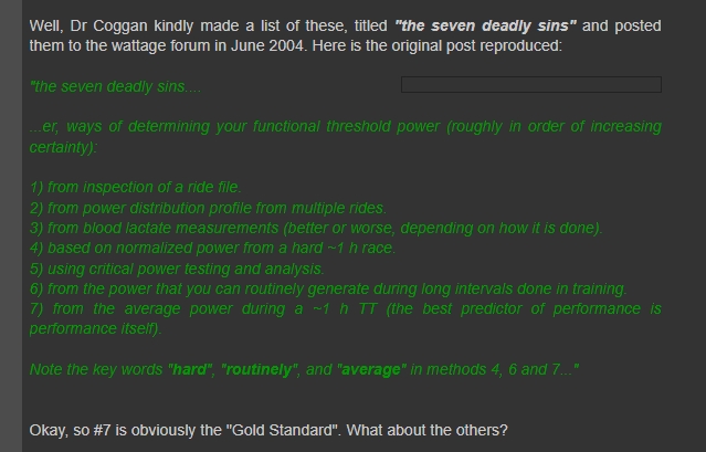 Elsewhere on the Wattage forum, he proposed (and/or cautioned against?) other methods for estimating FTP, but were not in themselves literally FTP. The “seven deadly sins”. The 5+20min*0.95 protocol was not on this list.