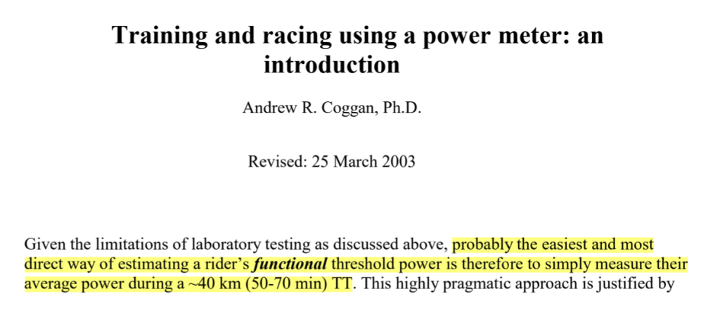 [P]robably the easiest and most direct way of estimating a rider’s functional threshold power is therefore to simply measure their average power during a ~40 km (50-70 min) TT.