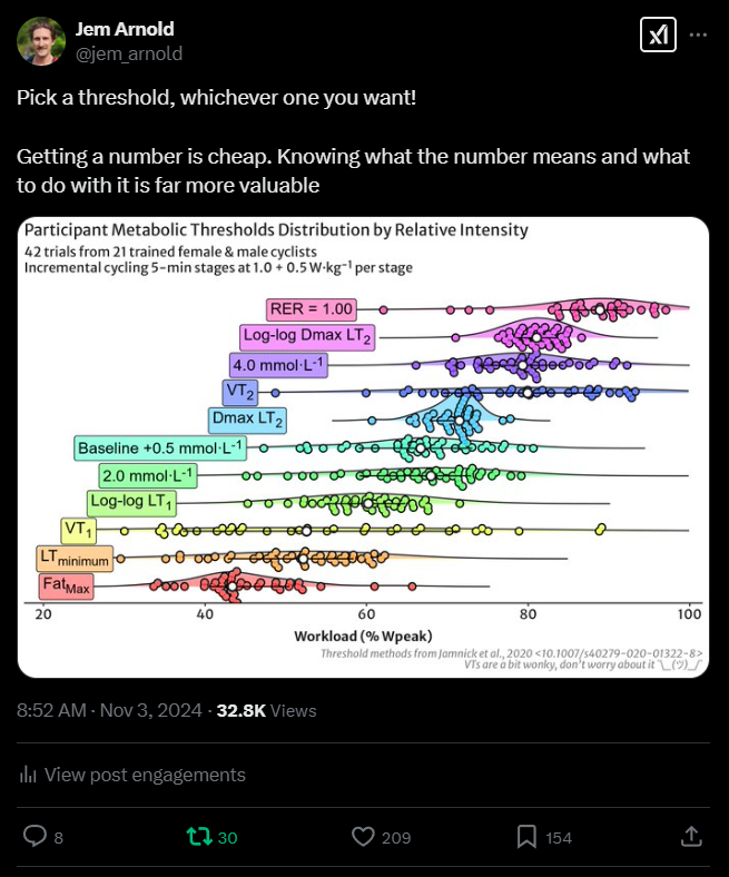 A wonderful story-telling figure showing a number of the more common methods for estimating lactate threshold, from: Jamnick NA, Botella J, Pyne DB, et al. (2018) Manipulating Graded Exercise Test Variables Affects the Validity of the Lactate Threshold and Vo2peak. PLoS One. https://doi.org/10.1371/journal.pone.0199794