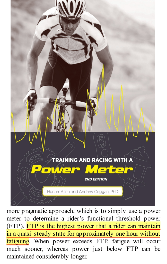 (A few pages later in TaRwaPM FTP is defined more literally: “FTP is defined as the highest average wattage or power that you can maintain for 60 minutes.” But this appears to be an offhand remark forgetting the proper nuance of the definition. So we’ll ignore it.)