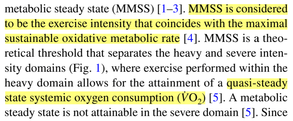MMSS is considered to be the exercise intensity that coincides with the maximal sustainable oxidative metabolic rate. MMSS is a theoretical threshold that separates the heavy and severe intensity domains (Fig. 1), where exercise performed within the heavy domain allows for the attainment of a quasi-steady state systemic oxygen consumption ( ̇V O 2 ) . A metabolic steady state is not attainable in the severe domain