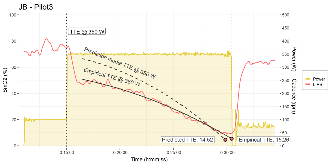 Our hypothesis is that the linear extrapolation of PS SmO2 during the work stage can predict time to exhaustion, when performed to task intolerance. Across both male and female subjects, we have seen that in 27 of 36 trials, both the vastus lateralis and paraspinals oxygenation slopes provide a reasonable prediction of TTE.