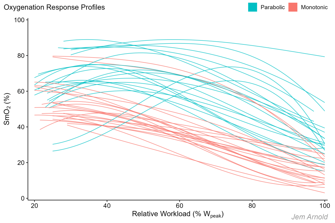 Oxygenation Response Profiles represent the SmO2 trend as a function of progressive exercise intensity measured at the vastus lateralis. Two general profiles have been observed that may reveal some so-far unexplained, but apparently systematic physiological variance between subjects of differing fitness and muscle tissue typology. Unexplained variation means we still have something to learn about human physiological response to exercise.